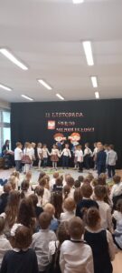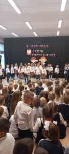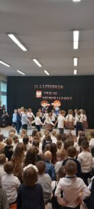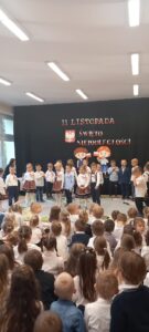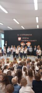 Odbyła się więc uroczystość upamiętniająca kolejną rocznicę odzyskania niepodległości przez Polskę. Z tej okazji dzieci z wszystkich grup oraz pracownicy przedszkola zebrali się, aby uroczyście świętować ten wyjątkowy dla Polaków czas. Wszyscy z powagą i w dużym skupieniu oglądali program artystyczny przygotowany przez dzieci z oddziału III.