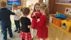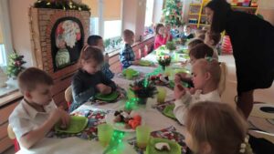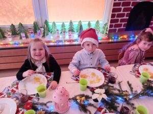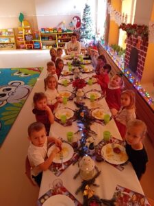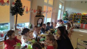 18 grudnia w naszym przedszkolu obchodziliśmy jeden z najpiękniejszych dni w roku – Wigilię Bożego Narodzenia. W salach przedszkolnych dzieci dzieliły się opłatkiem, składały sobie życzenia, a następnie zasiadły do pięknie przystrojonych stołów, na których czekał świąteczny obiad. Nie zabrakło również wspólnego kolędowania. Czas upłynął w bardzo miłej, serdecznej atmosferze. Wszystkie dzieci czuły zbliżające się wielkimi krokami Święta Bożego Narodzenia.
