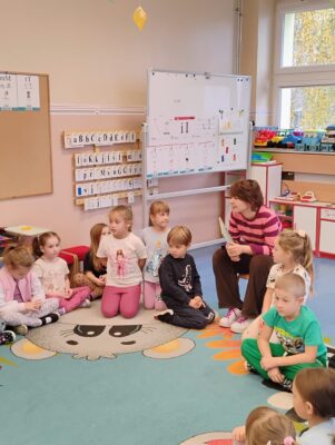 W ramach realizacji programu ,,Czytajmy dzieciom” zapraszamy rodziców do czytania bajek dzieciom w czasie odpoczynku po obiedzie. Pierwszą odważną mamą, która nas odwiedziła była mama Tadka, która zasłuchanym dzieciom czytała piękne opowiadania o emocjach.