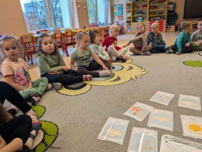 5 latki dołączyły do programu „Kubusiowi przyjaciele natury”. Podczas dzisiejszej misji dzieci dowiedziały się czym jest pogoda oraz wcieliły się w rolę prezentera pogody, dowiedziały się również czym jest klimat i jakie są różnice między nimi. Co to są zmiany klimatyczne i jak można temu przeciwdziałać oraz co każdy z nas może w takim razie zrobić.